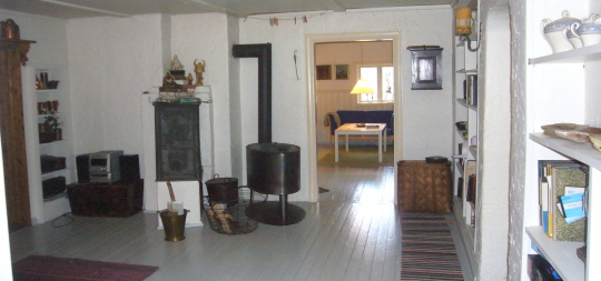 Huset er 180m2. I stueplan er et atelier, to store stuer med pejs og brændeovn, et køkken og et toilet. På 1. salen er der tre soveværelser og en alkove med i alt 10-12 sovepladser samt bad og toilet.